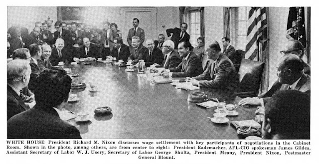 Richard Nixon, Post Master General Roy Blount and national union leaders in a photo op before trying to hammer out a wage agreement to end the strike.