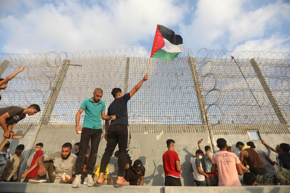 Palestinians protest in front of the fence encaging the Gaza Strip, August 21, 2021. (Mohammed Zaanoun/Activestills)