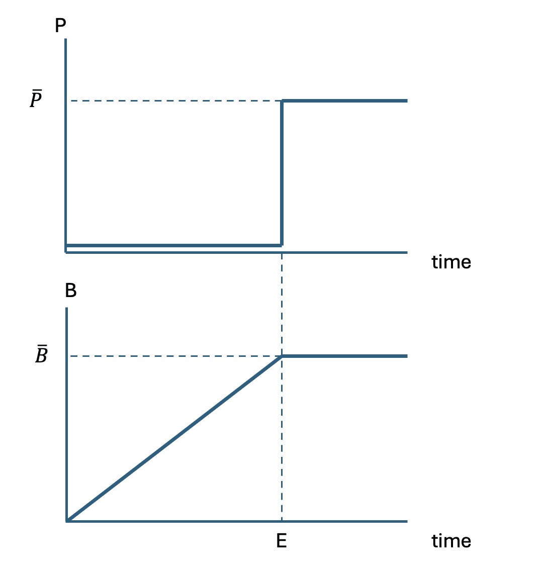 In my little model I don’t leave any room for degrading quality; enshittification takes place solely through higher prices. The model predicts the following paths for the price, P, and the customer base, B: