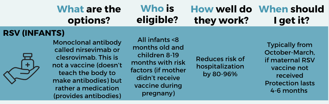 What: Monoclonal antibodies are not a vaccine (i.e., it doesn’t teach the body to make an immune response)—they are a preventive medication (providing antibodies directly and proactively). Last year’s real-world data showed that severe RSV in infants who received monoclonal antibodies was drastically reduced; one study achieved 90% effectiveness. This is a game changer for babies! This year, there are two options: nirsevimab or clesrovimab.