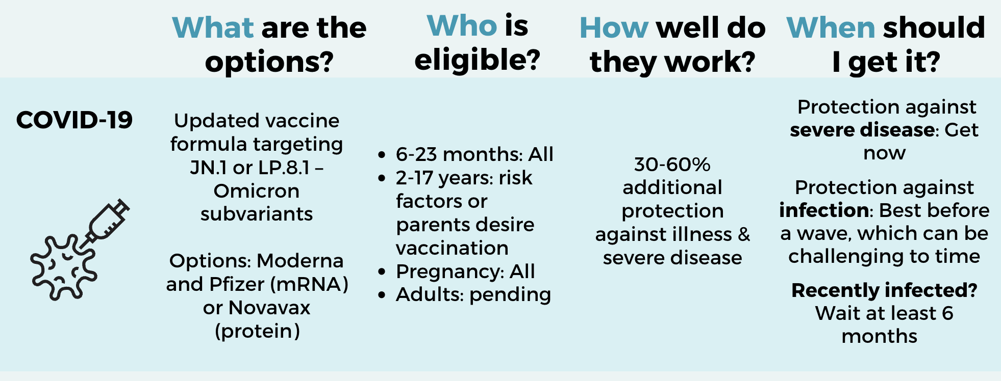 What: The fall Covid-19 vaccines have an updated formula targeting JN.1 or LP.8.1, which are Omicron subvariants. We don’t know their effectiveness in humans yet, but updated vaccines have consistently provided ~30-60% additional protection against urgent care visits or being hospitalized compared to people who didn’t get the vaccine in the fall. We lack comprehensive studies on the prevention of infection (or transmission), but previous studies estimate it to be around 20-30%.