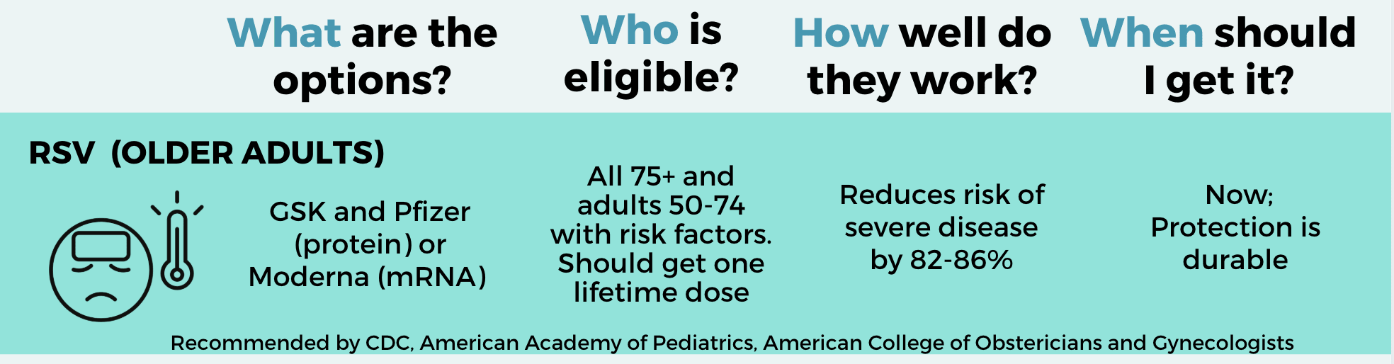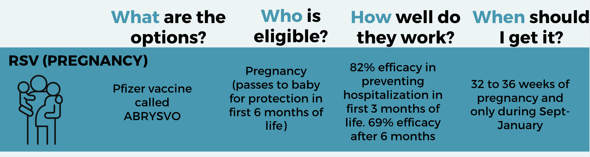 What: One vaccine is available: Pfizer’s ABRYSVO. Protection is passed from the mother to the baby so the baby is protected in the first 6 months of life, which is the riskiest time for severe RSV. Thousands of pregnant women got it last year, confirming the safety and high effectiveness (70-85%).
